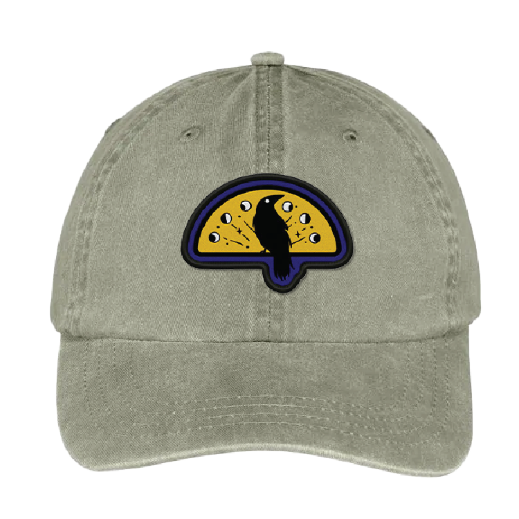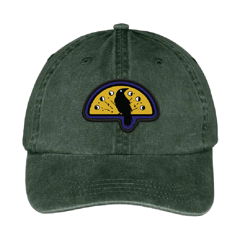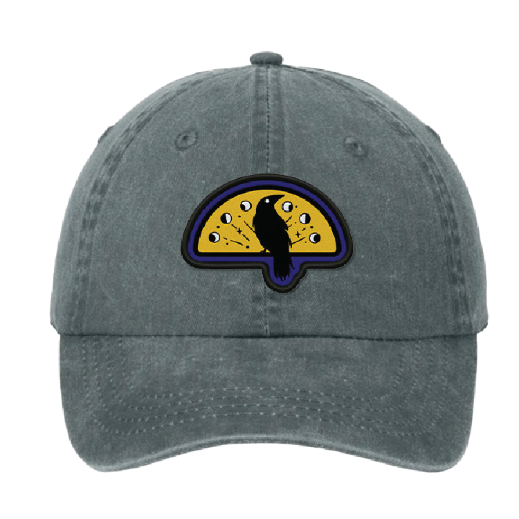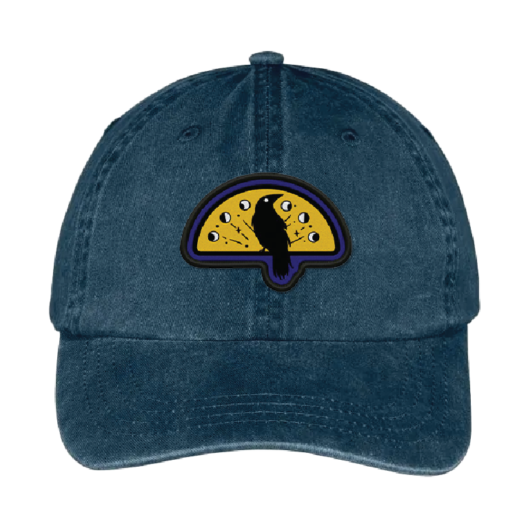 Heat applied patch on baseball cap The design features a raven circled by the phases of the moon on a yellow background with a purple border. Artwork Size: 2.8 inches wide x 2 inches tall Adams Headwear Cap: 100% garment-washed cotton twill Unstructured, six-panel, low-profile Matching color self-fabric sweatband Tuck-away leather back strap with antiqued brass buckle and grommet Each item is hand crafted in Watertown, MA