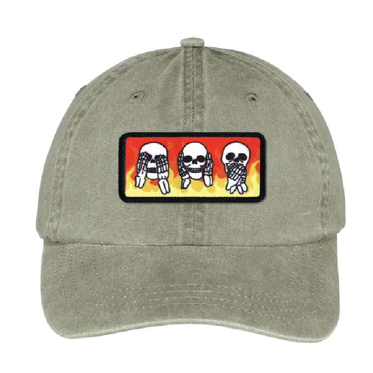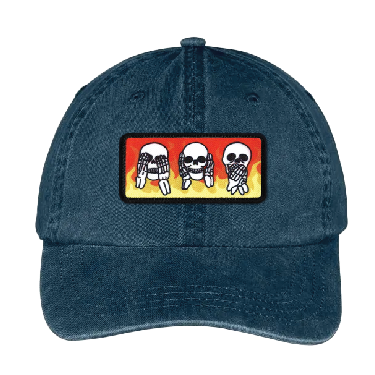 Heat applied patch on baseball cap hat The design features 3 skulls with “see no evil, hear no evil, speak no evil” expressions. The background is composed of red, orange, and yellow flames. Artwork Size: 3.3 inches wide x 1.6 inches tall Adams Headwear Cap: 100% garment-washed cotton twill Unstructured, six-panel, low-profile Matching color self-fabric sweatband Tuck-away leather back strap with antiqued brass buckle and grommet Each item is hand crafted in Watertown, MA